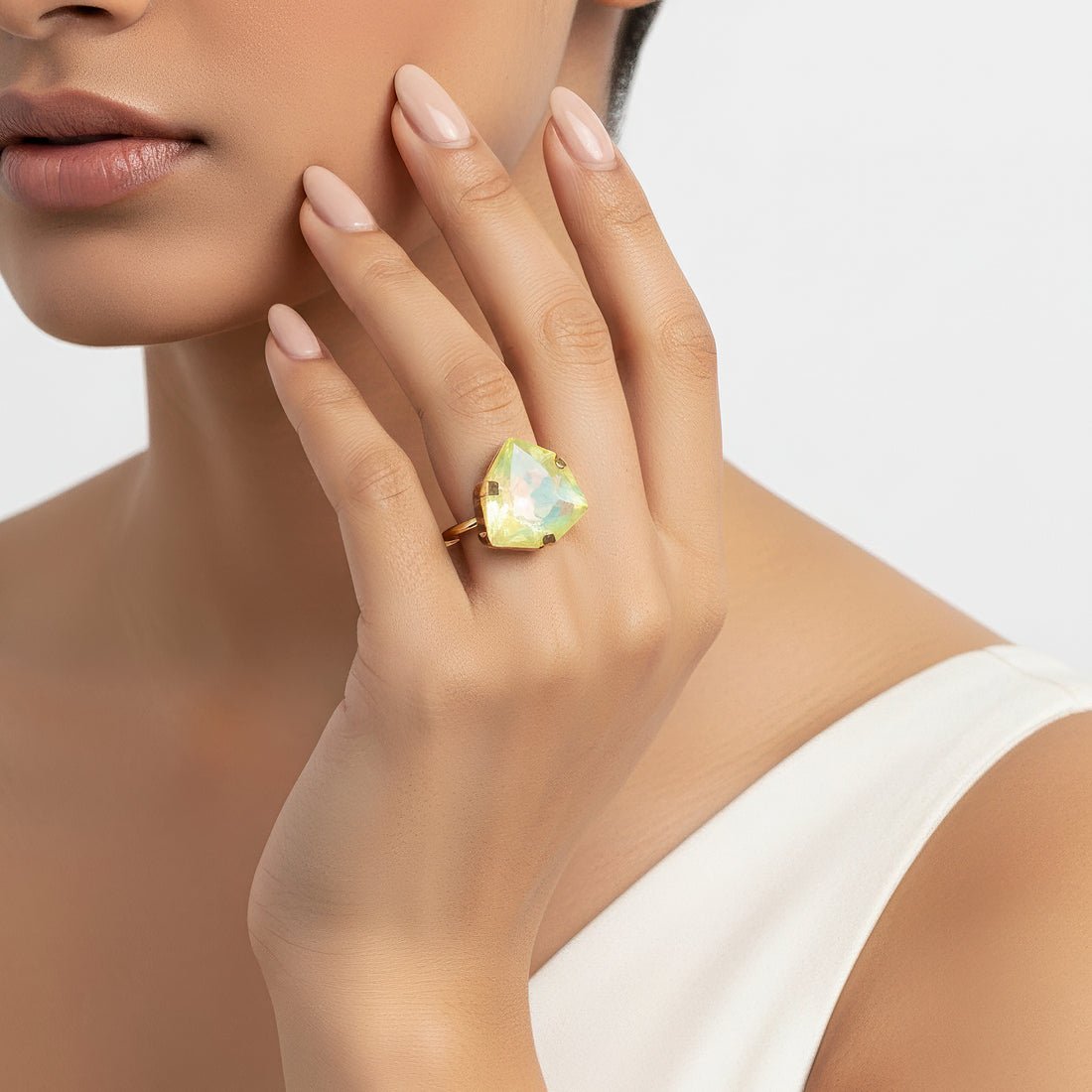 The rectangular champagne-colored crystal in this gorgeous ring radiates coziness and tasteful elegance. The crystal's...