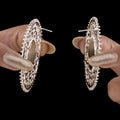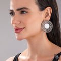 Introducing the PRAO Oversized Mirror Earrings, a stunning statement piece crafted from oxidized silver. These ethnic earrings boast a central mirror that adds a unique, reflective touch to your ensemble. The intricate detailing around the mirror enhances the ethnic appeal, making them a perfect accessory for both traditional and contemporary outfits. Finished with a silver sheen, these earrings are designed to catch the light and the eye, ensuring you stand out in any crowd. Elevate your jewelry collection with these elegant and bold statement earrings from EYRA.