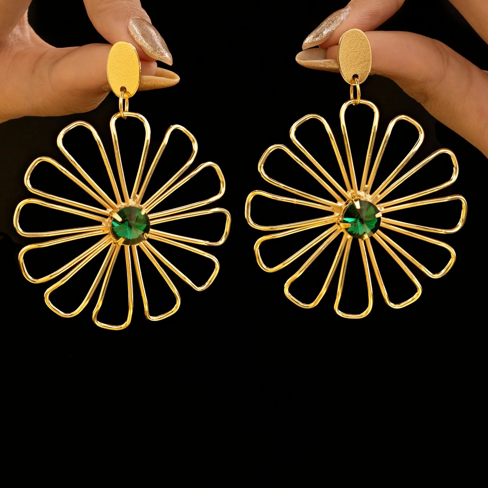 EYRA Earrings Anti-Tarnish Golden Flower & Emerald Danglers