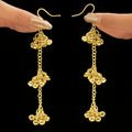 These magnificent long earrings are a beautiful blend of tradition and style, with elaborate craftsmanship and delightful ghungroos that make a soothing, musical sound with each movement. They are designed to enhance both casual and festive looks and go well with ethnic apparel like sarees, lehengas, and salwar suits. The lightweight yet robust craftsmanship ensures all-day comfort, while the timeless style elevates any ensemble. These earrings are adaptable additions to any jewelry collection, making them ideal for weddings, festivals, and special occasions. Their distinct style makes them a striking adornment that honors heritage and personality. These earrings will make a lasting impression whether worn alone or with other pieces of jewelry.