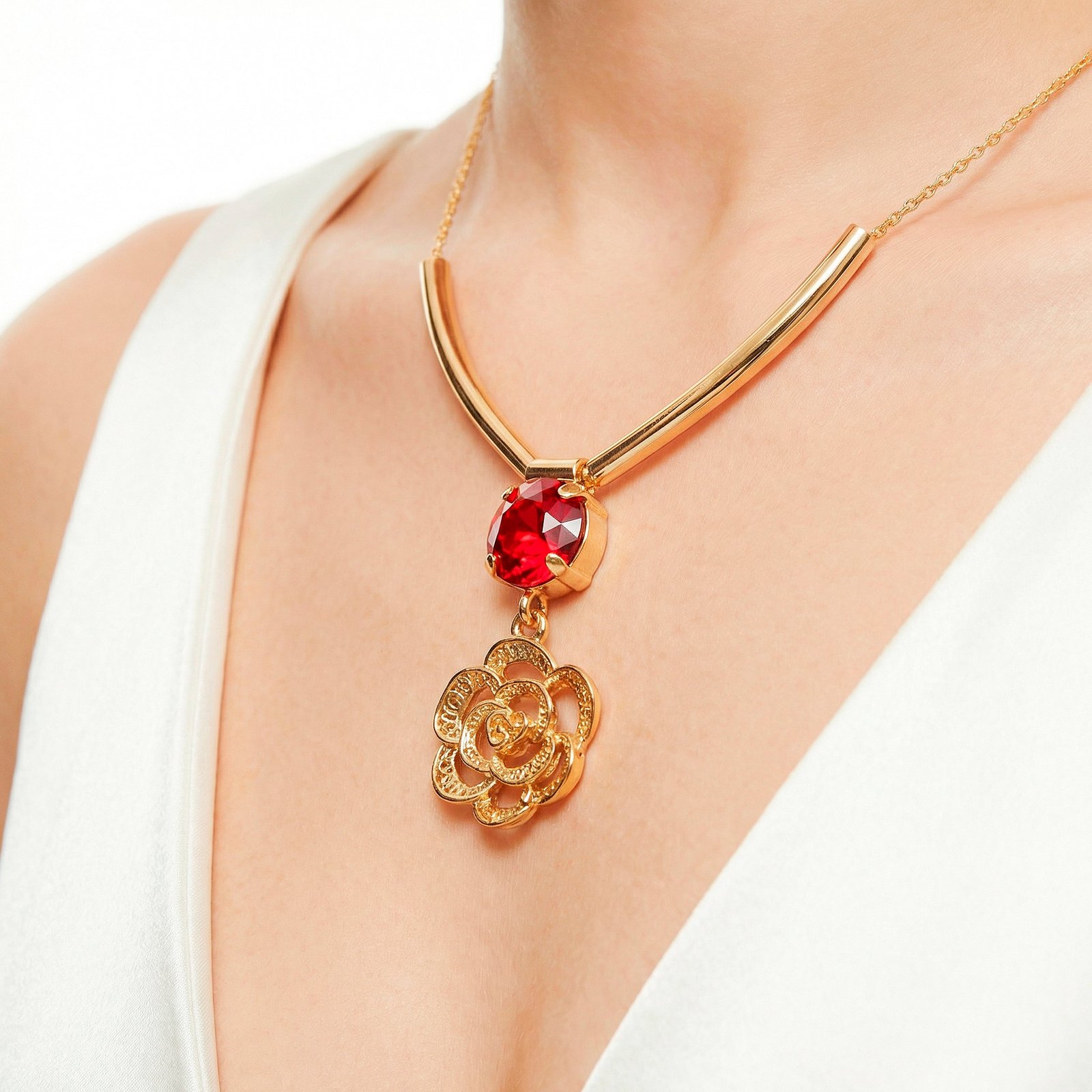 This magnificent jewelry set exemplifies delicate craftsmanship and enduring beauty. The necklace features a cutout rose flower pattern, which is masterfully made to accentuate its complex elements. A sparkling crystal in the heart of the rose adds a hint of sparkle, providing a striking focal point that heightens its romantic appeal. The matching earrings, which replicate the rose motif, perfectly complement the necklace with their beautiful and lightweight design. This combination is perfect for both regular use and special occasions, adding a feminine and classy touch to any ensemble. Whether as a kind present for someone special or as a stylish addition to your own collection, this jewelry set exudes elegance and grace, capturing the essence of natural beauty in each detail.