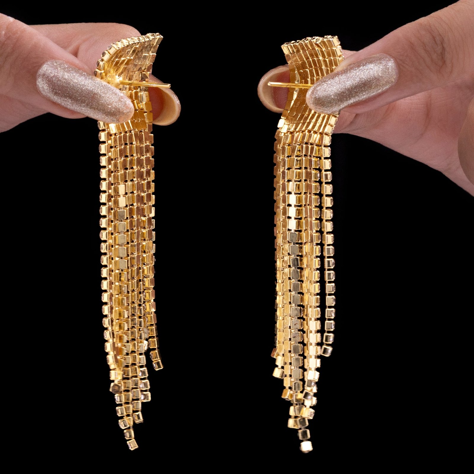 These gorgeous rhinestone tassel chain dangle earrings will make a striking fashion statement. They have a sleek, mobile-inspired design that radiates contemporary elegance with a dash of glitz. With each movement, the glittering rhinestones produce a stunning effect as they catch the light. They are the ideal accessory for evening events, parties, and special occasions because of the elegant fluidity that long, delicate tassel chains bring. These striking yet lightweight earrings add a sleek and sophisticated tone to your entire ensemble while providing comfort. They effortlessly add a bit of shine and charm to any ensemble, whether it's a chic dress, a sleek gown, or even a fashionable casual ensemble. These earrings are a must-have for any jewelry collection and are ideal for people who enjoy modern style with a touch of luxury.
