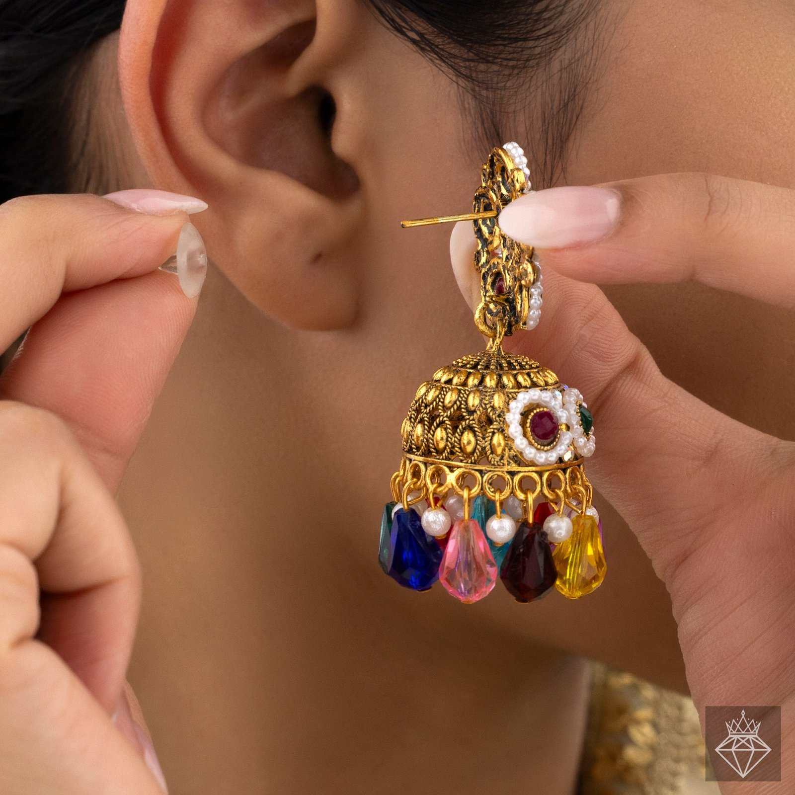 Celebrate classic style with these colorful jhumki earrings, which feature a tasteful combination of tiny pearl embellishments and multicolored crystals. Rich cultural legacy and traditional artistry are reflected in the delicate details of each piece, which is meticulously created. Vibrant colors and glittering embellishments give the traditional jhumki silhouette a contemporary touch, making it a unique piece for weddings, cultural events, and festive occasions. They offer charm and sophistication to your attire while being lightweight and attractive. They sway gracefully with every movement. These earrings are a must-have for everyone who enjoys elaborate, expressive jewelry since they go well with ethnic clothing or give a splash of color to fusion ensembles. Add a piece that masterfully strikes a balance between history and modern flair to your collection.