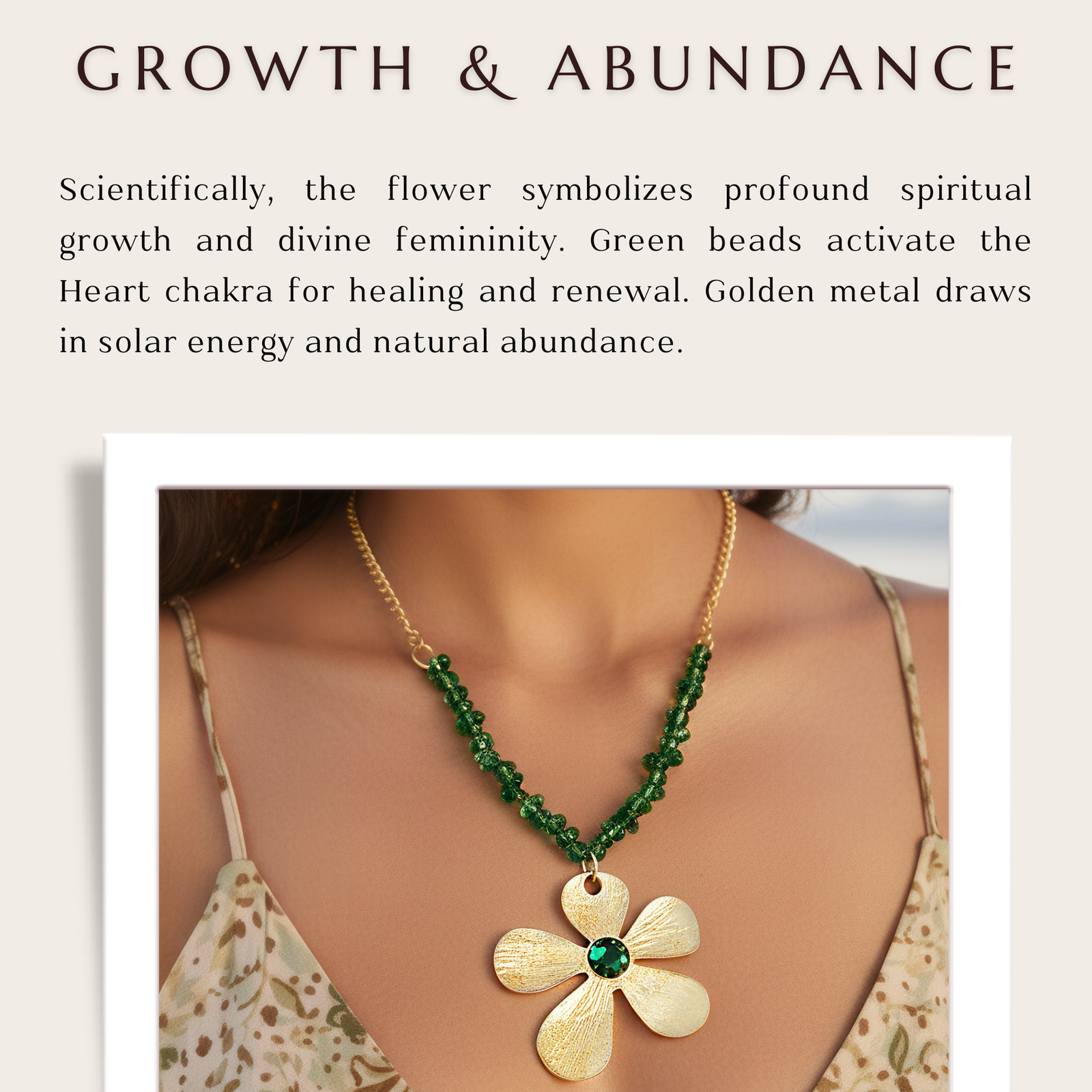 This necklace is delicate and charming, with a delicate floral pendant that is embellished with uncut beads that give it a raw, organic elegance. Each bead gives the floral motif more depth and texture, and the pendant's careful design aims to convey the spirit of handcrafted creativity. The necklace, which is suspended from a matching chain, is the ideal combination of sophisticated design and natural beauty. Its lightweight feel makes it suitable for regular use, while the unusual details allow it to stand out as a modest statement item. This necklace lends a touch of earthy refinement to any ensemble and goes well with both elegant and casual outfits. It adds elegance to any jewelry collection and is a lovely fusion of modern fashion and nature-inspired design.