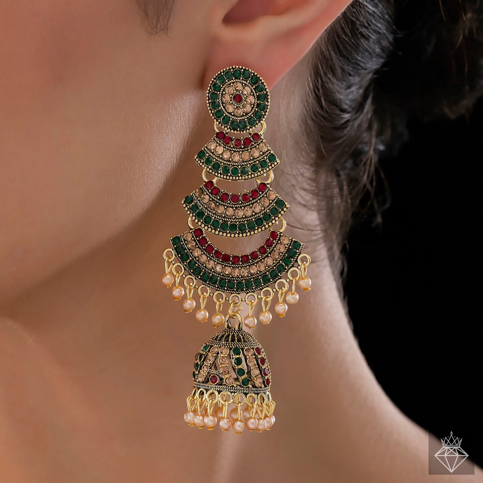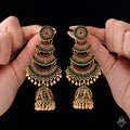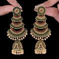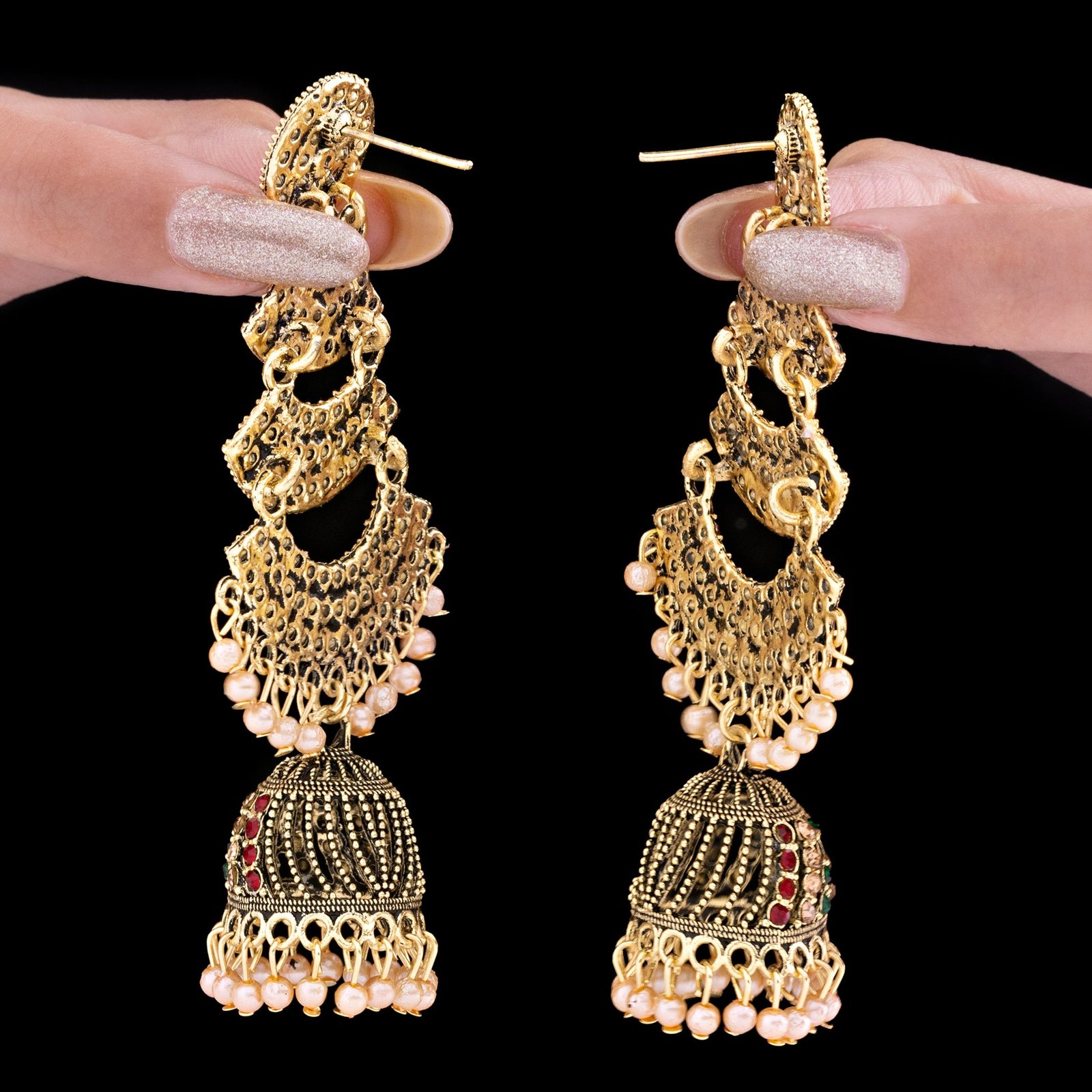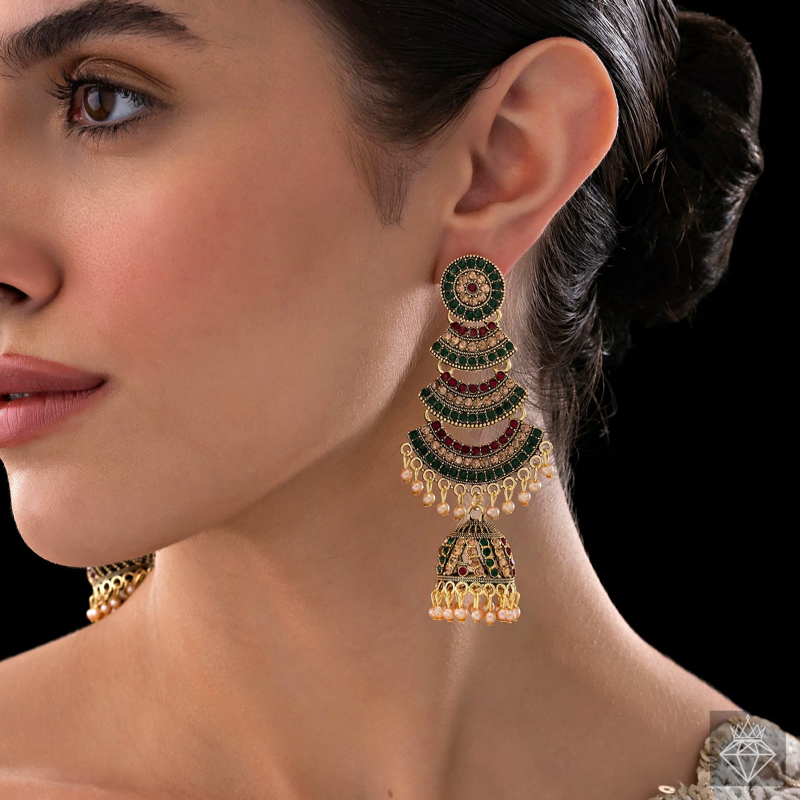 These gorgeous multi-tier long dangling earrings will add a touch of classic elegance to your ethnic ensemble. Each tier has stunning stone embellishments that catch the light brilliantly, and they are all intricately crafted. Richly embellished with glittering stones and delicate pearl accents, the earrings flow elegantly into a classic jhumki, lending it a delicate, feminine beauty. The layered design keeps a sophisticated and elegant appearance while producing a statement-making effect. These earrings go well with sarees, lehengas, and anarkalis and are ideal for weddings, holiday festivities, or cultural events. Even though they have a striking appearance, they are comfortable and lightweight for prolonged use. These earrings are a must-have for any jewelry collection honoring traditional Indian aesthetics because of their exquisite craftsmanship, glowing finish, and tasteful fusion of heritage and glamour.