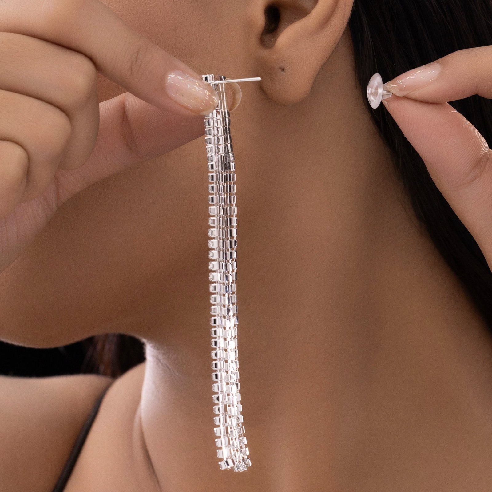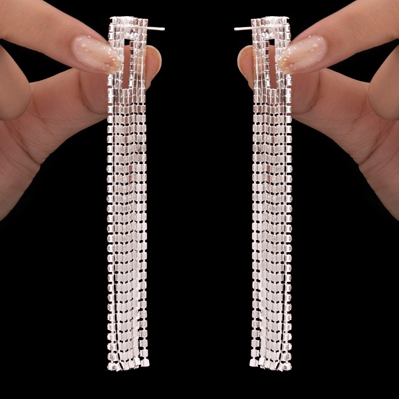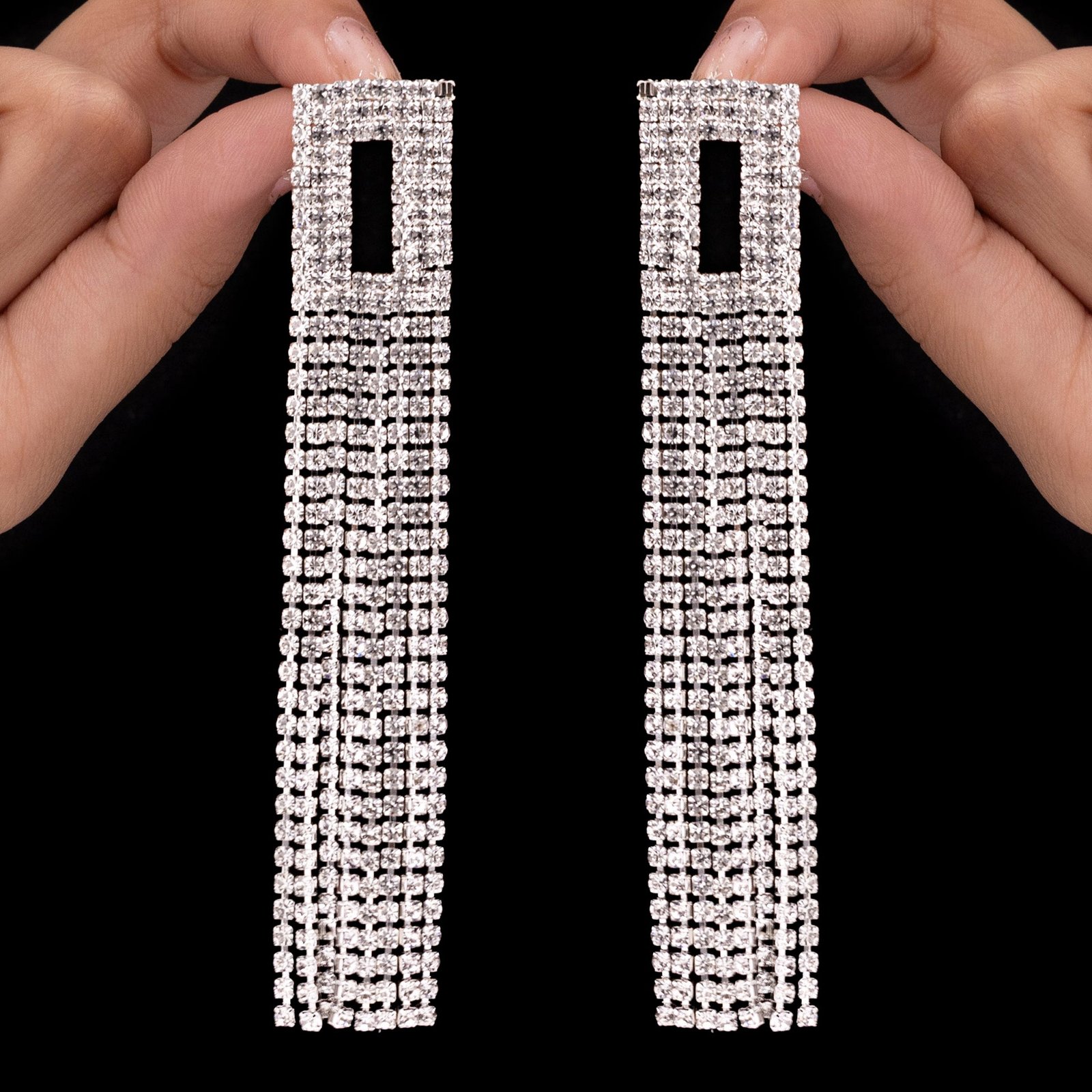 The cascading tassels on these hollow square rhinestone toppers add a touch of modern elegance to your ensemble. The open square form adds a modern touch, and the shape is outlined by glistening rhinestones, which perfectly blend sparkle and structure. Delicate, long tassels cascade elegantly from the base, giving your ensemble movement and a touch of drama. These comfy and lightweight earrings are perfect for nighttime gatherings, celebrations, or any occasion where you want to stand out stylishly. From cocktail dresses to sarees and lehengas, the adaptable style goes well with both traditional and western attire. These earrings add a striking, dazzling appeal that is both stylish and classic, whether you're attending a party or just adding flair to your regular outfit.