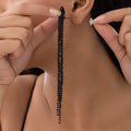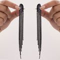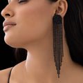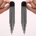 These striking D-shaped spectacular stud earrings with stunning black rhinestone tassels will turn heads. Encrusted with black, sparkling stones, the structural D-shaped top radiates edge and elegance. Long, cascading tassels that flow elegantly from the base capture the light as they move, producing an enthralling effect. These XL-shaped earrings are ideal for drawing attention at special events, parties, and evening gatherings. They are designed to be surprisingly light and comfortable for prolonged use, despite their bulk. Because of their adaptability, the black rhinestones go well with both traditional and modern ensembles. These earrings add drama, sophistication, and glitz to your accessory collection, whether they are worn with a gown, saree, or stylish western ensemble.