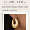 The strong form of these hefty hollow hoops is given depth and character by their eye-catching lined texture. Their wide, eye-catching design is meant to create a statement, yet their hollow structure keeps them comfortable and light enough to wear all day. Every time the head is turned, a faint shimmer is produced by the exquisite way the rough lines catch and reflect light. These hoops are ideal for giving any ensemble a dash of contemporary edge, and they go well with both casual daytime ensembles and elegant evening wear. They are a flexible complement to any jewelry collection because of their classic round shape and modern lined finish. These hoops provide comfort, style, and a sophisticated touch whether worn alone for impact or combined with other items.