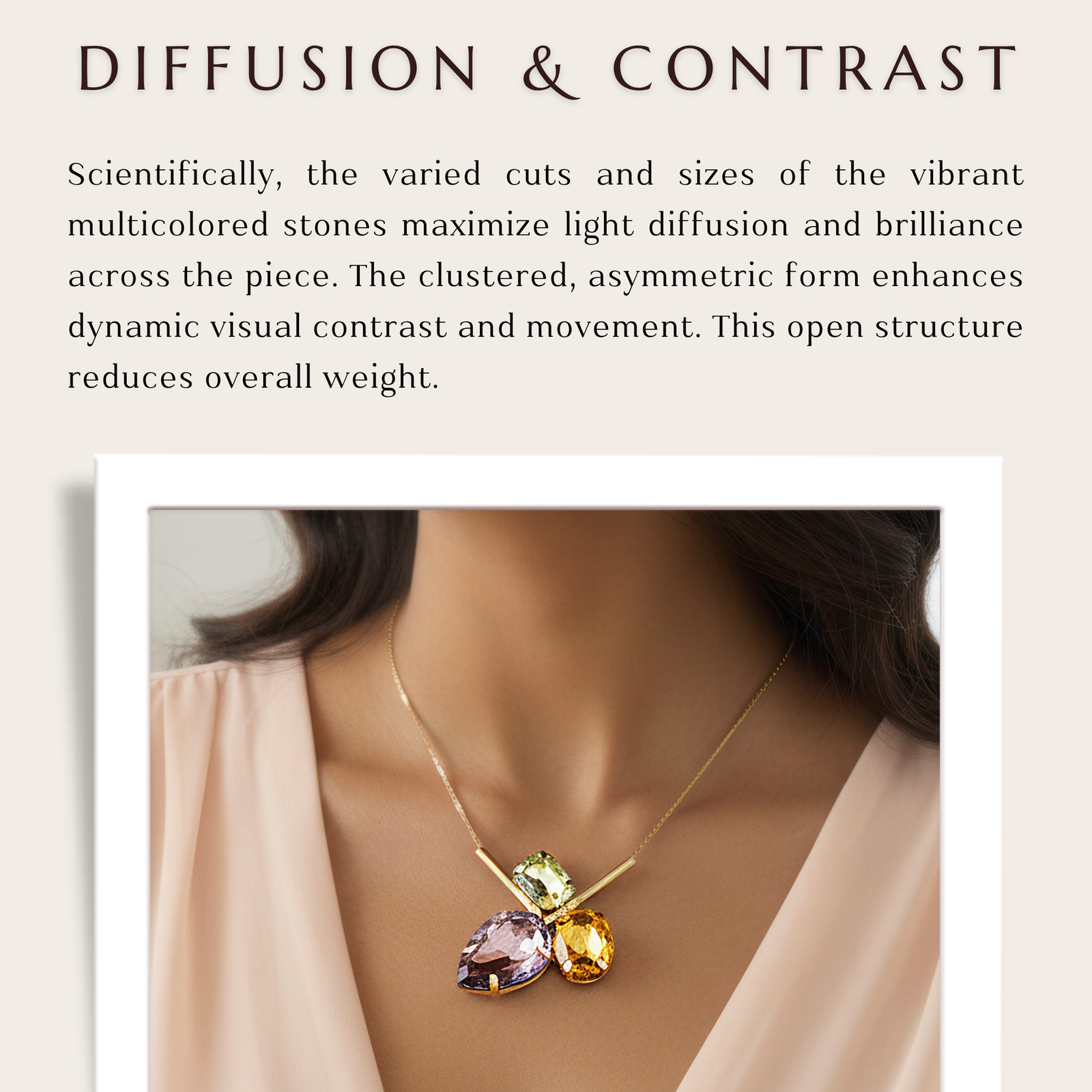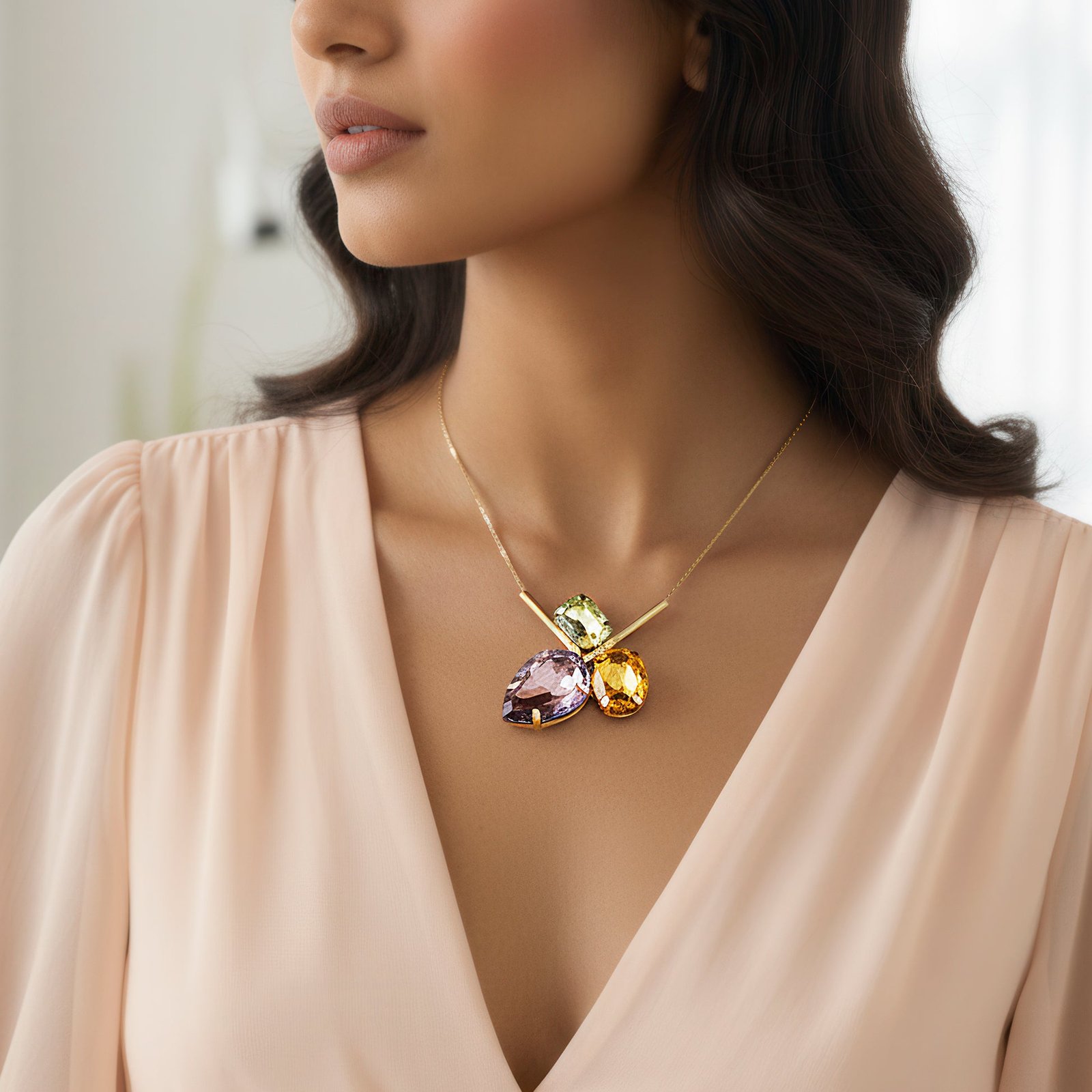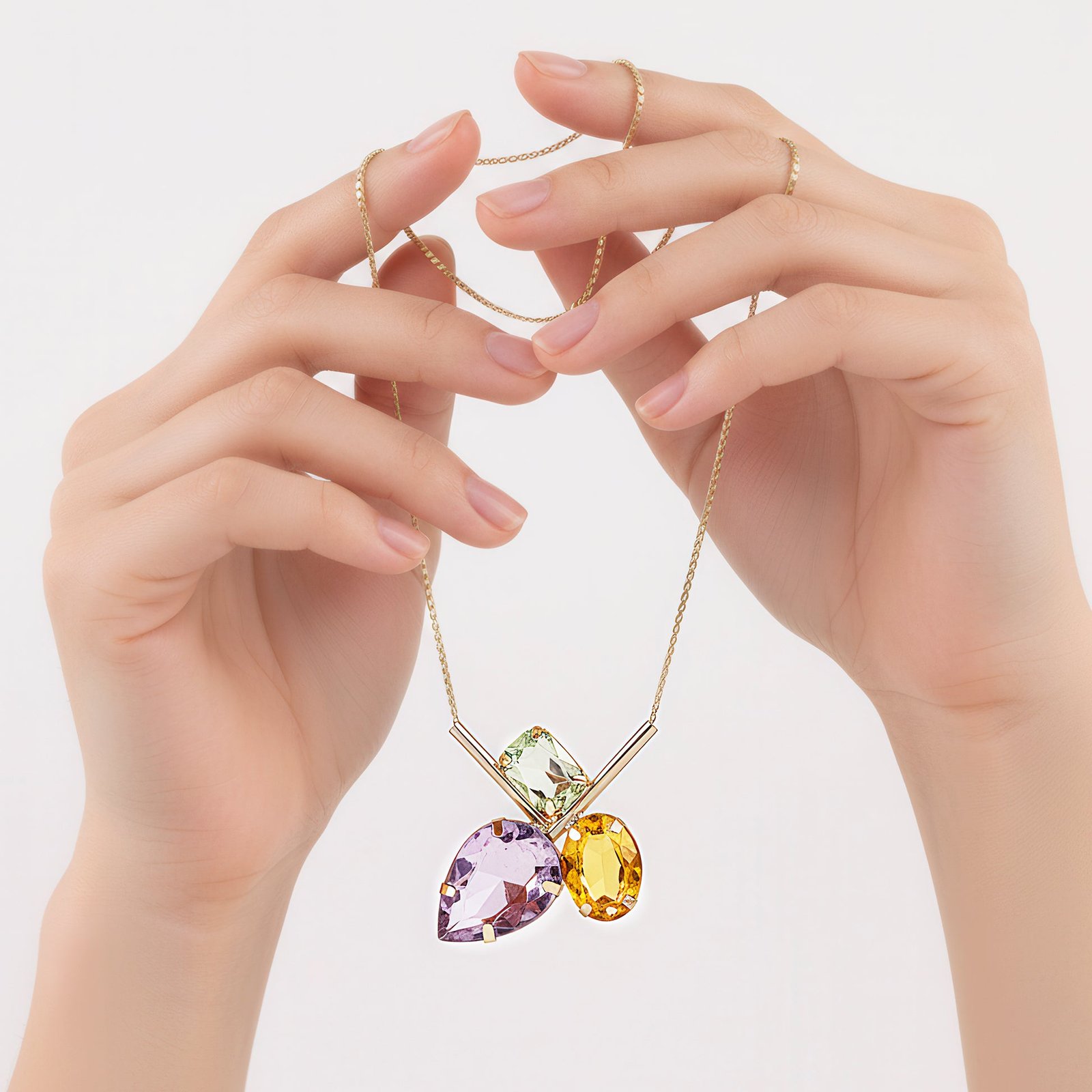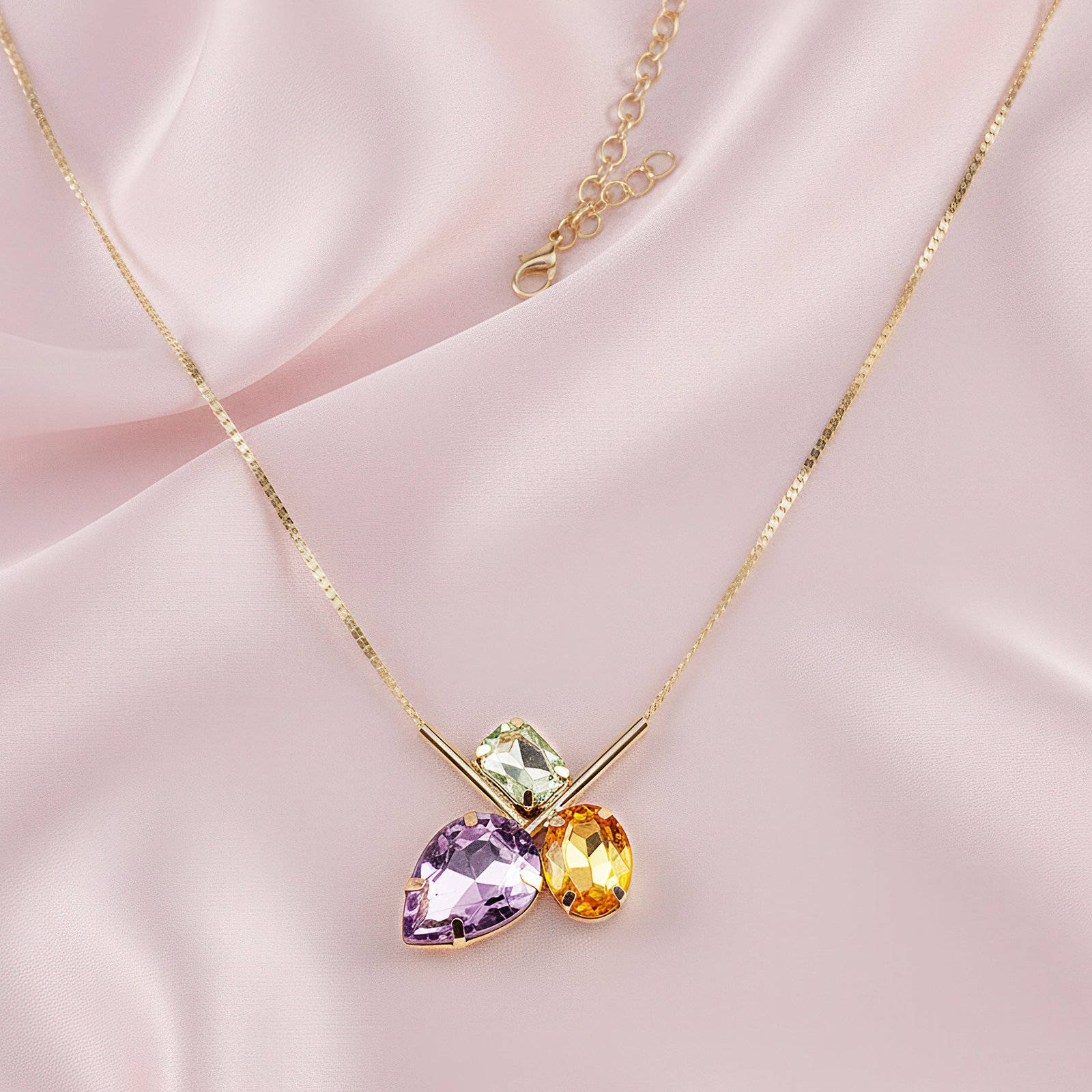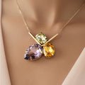 The intriguing tri-shape design of this pendant necklace perfectly combines drop, oval, and rectangular cuts. The rectangle cut offers contemporary structure and bold definition, the oval cut adds a hint of softness and fluidity, and the delicate drop shape lends classic elegance. These three unique shapes work together to produce a composition that is startling and well-balanced, showcasing the beauty of geometric diversity. The pendant, which gleams with each movement while hanging on a slender chain, exudes elegance and charm. Its adaptable style makes it appropriate for major events as well as daily use, providing a striking item that looks great from day to night. This necklace is chic and modern, designed to provide radiant appeal and understated elegance to any ensemble.