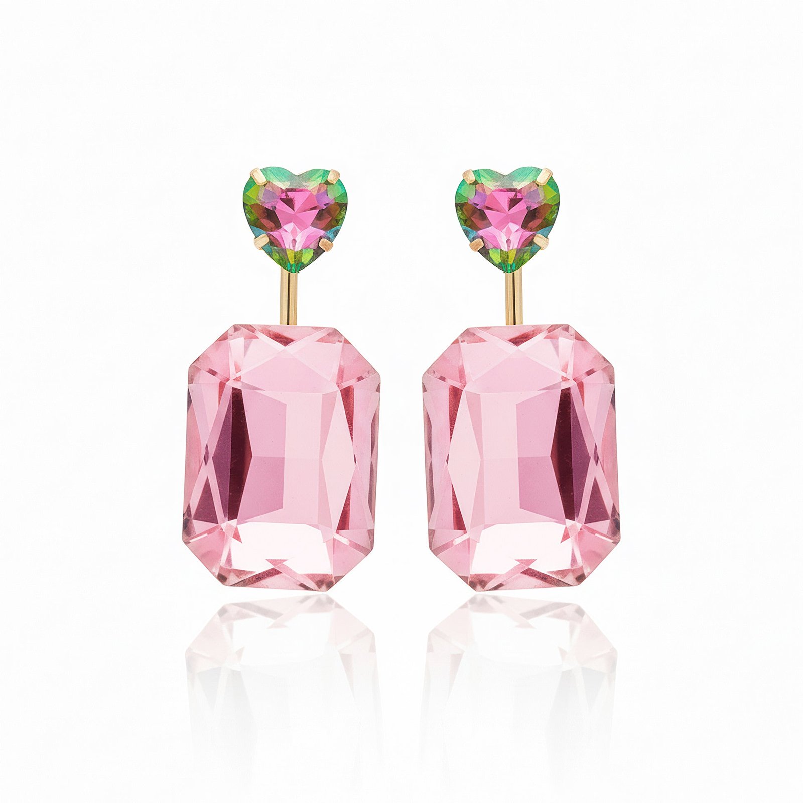 With their combination of detachable rectangular emerald-cut vintage rose crystals and rainbow-colored heart toppers, these convertible earrings have a whimsical yet sophisticated appearance. The vintage rose crystals provide a hint of classic sophistication with their elegant brilliance, while the rainbow heart tops add a lively and young charm that represents love and positivity. You may wear the heart studs alone for a delicate splash of color or add the hanging crystals for a more dramatic and glitzy effect thanks to the convertible form. These earrings are made to fit a variety of moods and situations, so they go well with both daytime and nighttime attire. They are a must-have piece for anyone who appreciates adaptable and expressive jewelry since they are comfortable and lightweight, offering the ideal fusion of contemporary creativity and traditional elegance.
