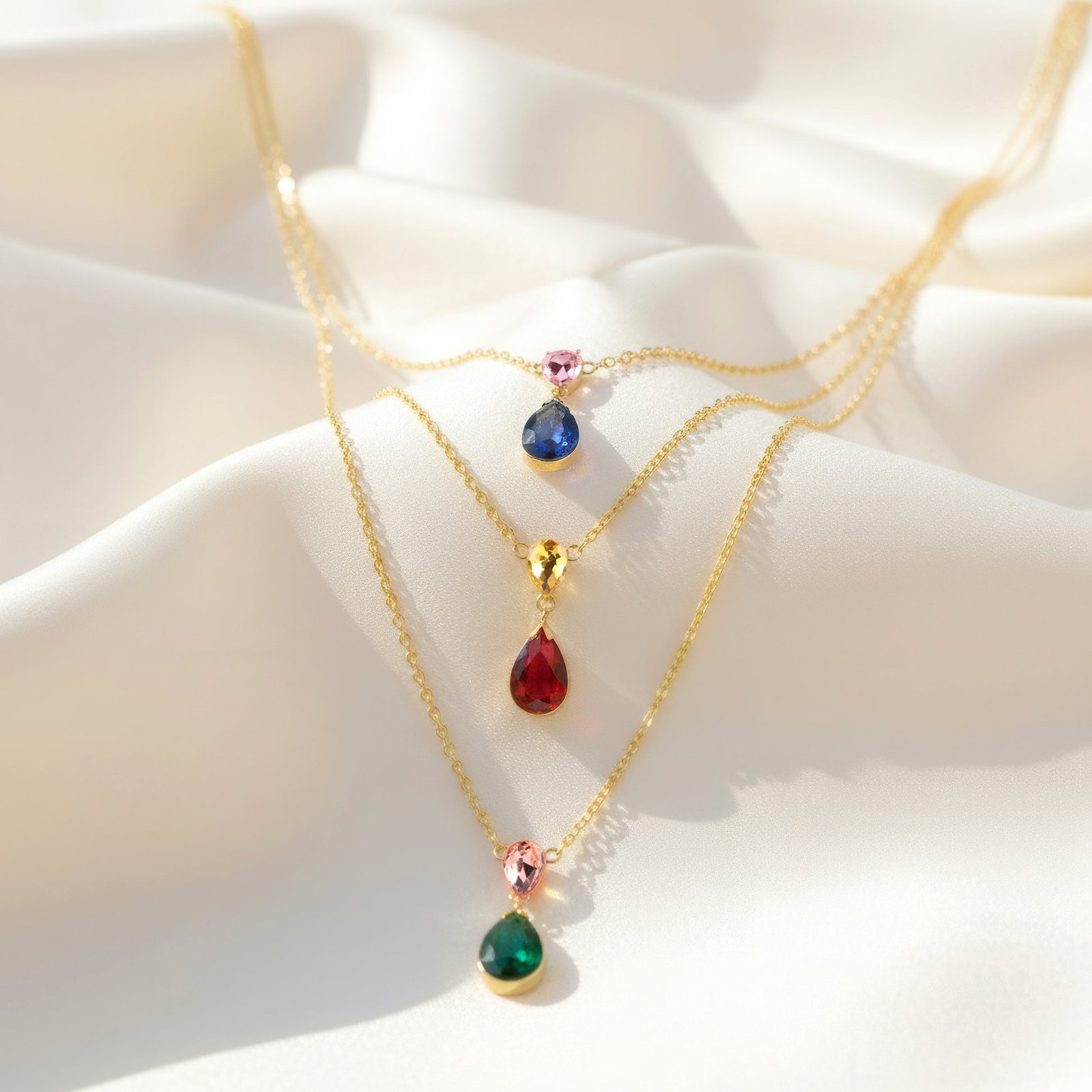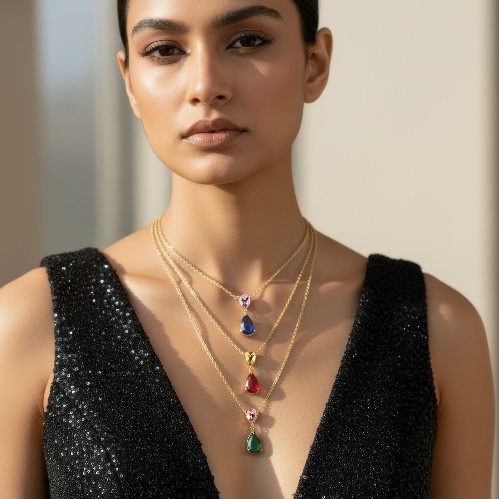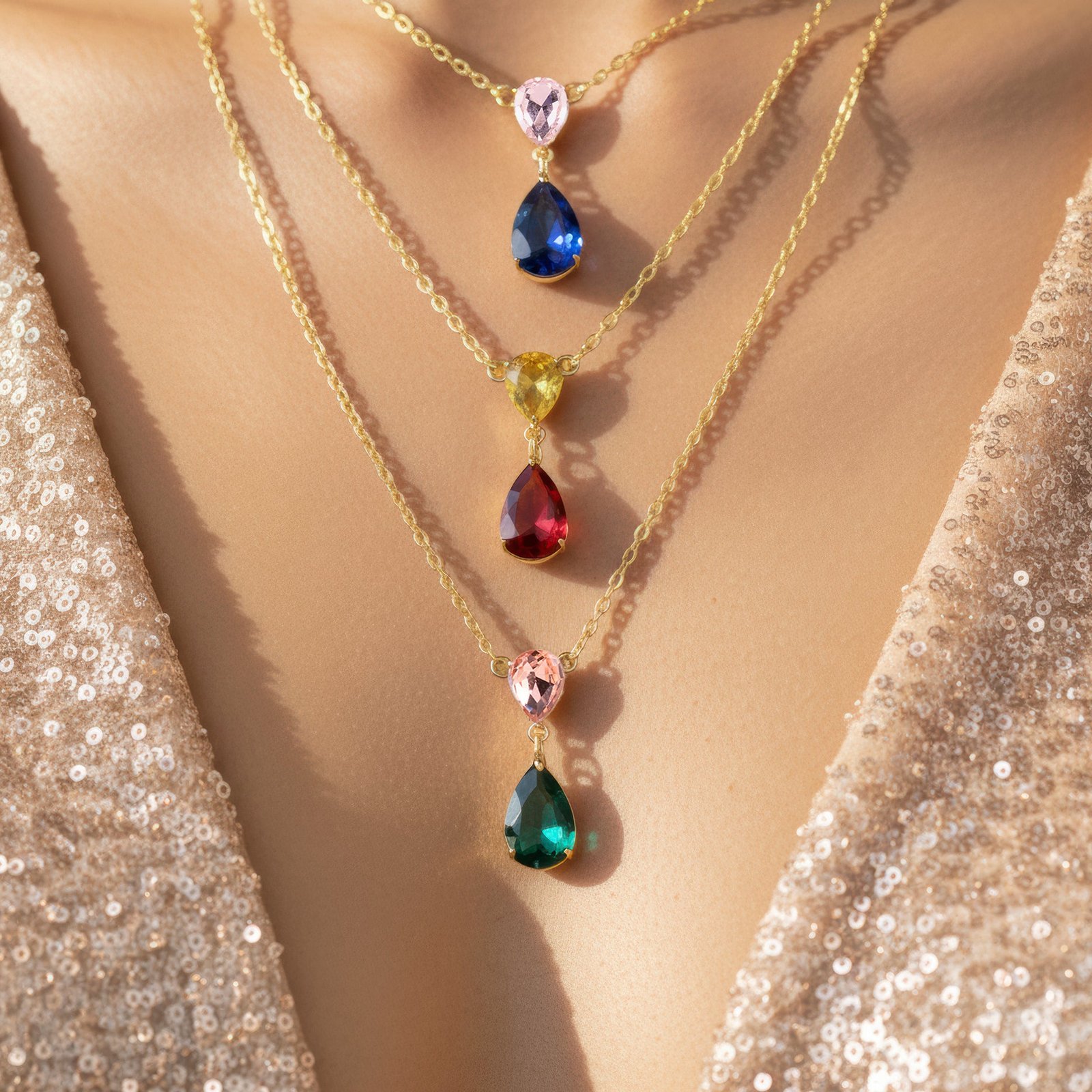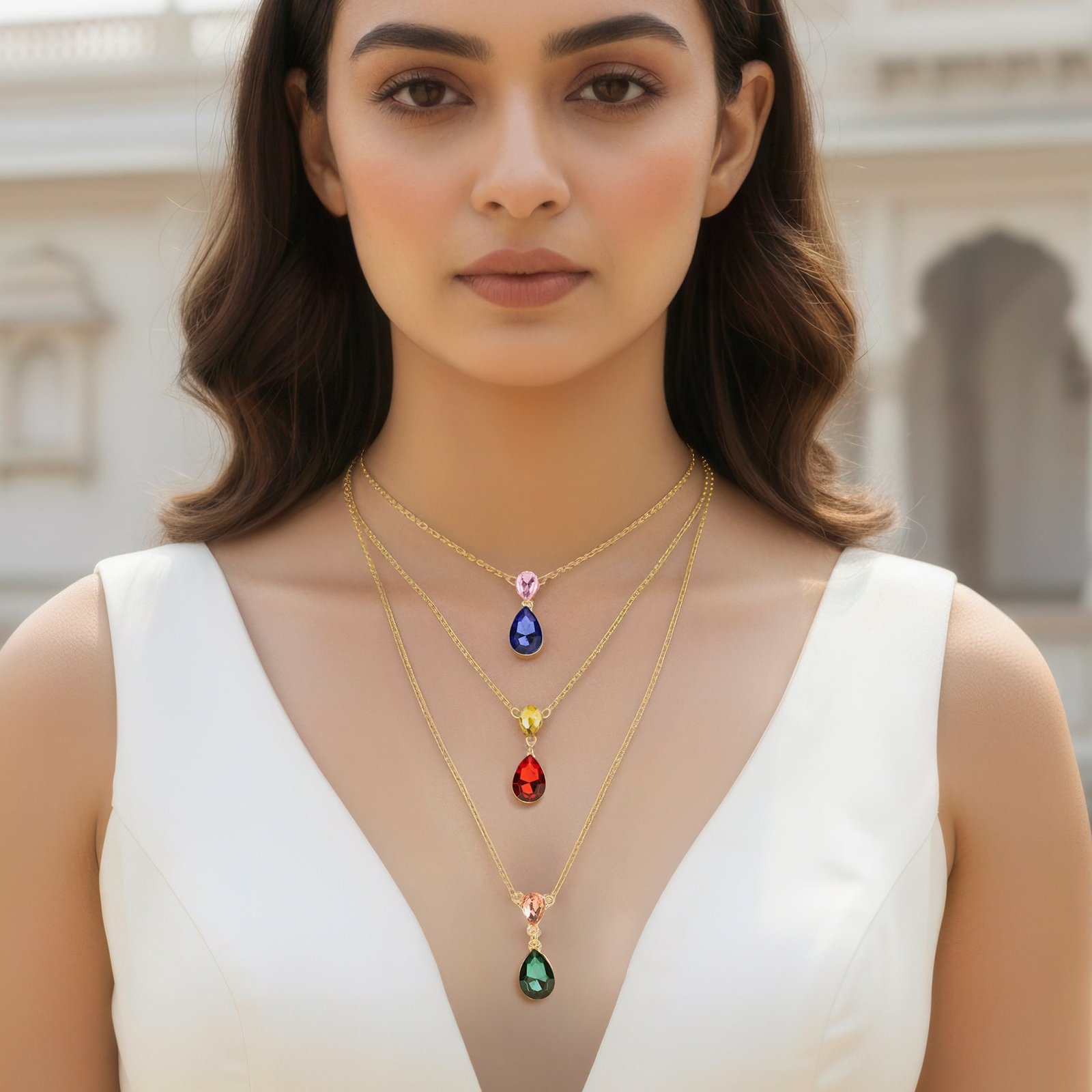 This exquisitely crafted triple-layer chain necklace with multicolored drop pendants will add a pop of color to your ensemble. Each layer is expertly designed to fall at different lengths, producing a lovely, tiered look that elegantly frames the neckline. The design is adaptable enough to go with both formal and casual attire because to the vibrant pop of the multicolored, dazzling drop pendants. It provides uncomplicated styling for daily looks, parties, seasonal events, or evening outings and is lightweight and comfy to wear. Its classic yet contemporary style guarantees that it goes well with a variety of ensembles, from traditional to western dress. Combining sophistication, color, and charm into one accessory, this necklace is ideal as a thoughtful present or as a fashion-forward statement piece.