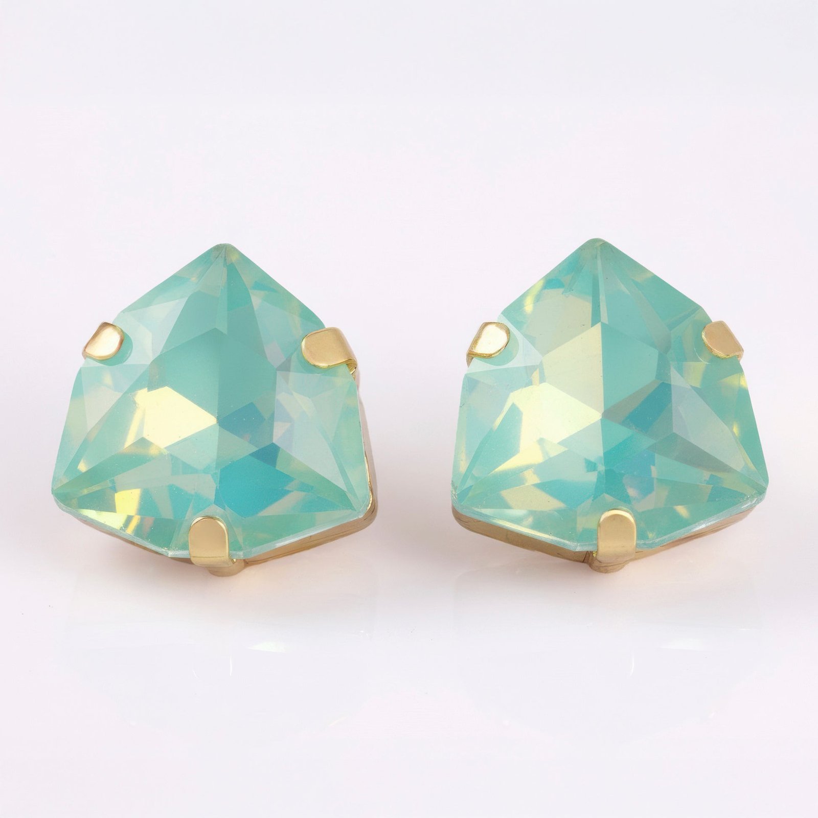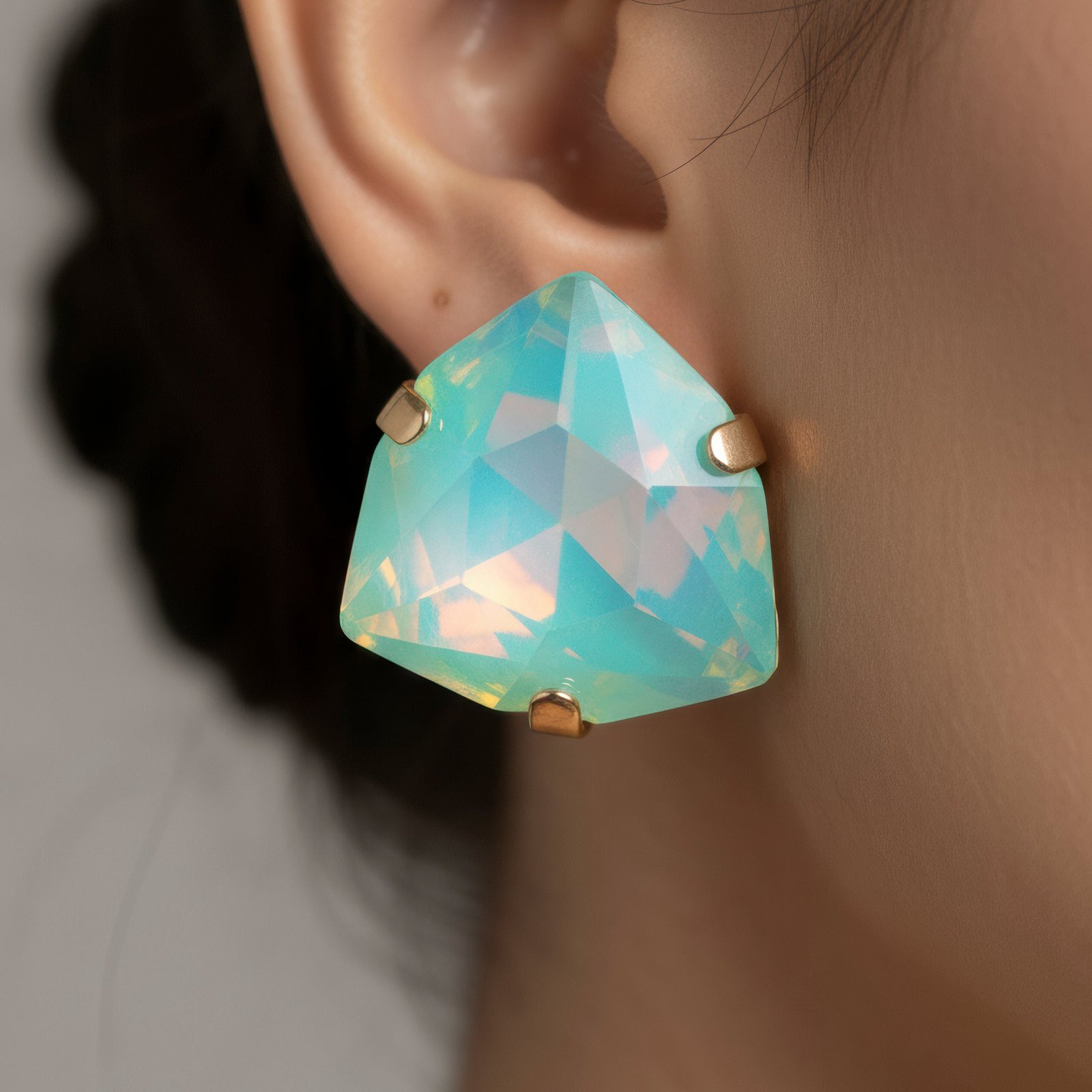 These minimalist yet eye-catching stud earrings are designed to give your look a pop of glitter. A trillion-cut stone in a stunning opal sea green hue adorns each earring, exuding a cool, ocean-inspired charm. The triangular cut adds sparkle and gives traditional stud designs a modern twist. They offer elegance without overpowering your appearance and are comfortable and lightweight, making them perfect for both special occasions and everyday wear. These studs are a versatile addition to any wardrobe because they look great with formal wear, ethnic clothing, and western ensembles. They also make a great present because of their elegant yet simple appearance. These earrings are a classic addition to any jewelry collection since they are stylish, sophisticated, and striking.
