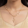 This rose gold necklace set has a sophisticated leafy pattern that exudes charm and sophistication, drawing inspiration from the delicate beauty of nature. The exquisitely designed necklace, with its leaf designs that perfectly combine contemporary design with classic elegance, hangs elegantly around the throat. The set produces a matched look that is eye-catching and adaptable when paired with matching earrings. Because of its comfortable lightweight design, it may be worn for extended periods of time at celebrations, weddings, and parties. Its delicate rose gold finish enhances warmth and a sophisticated sheen, going well with both classic and modern ensembles. This jewelry set easily improves your appearance, whether it is used as a striking accent to regular clothing or as a statement piece for special events.