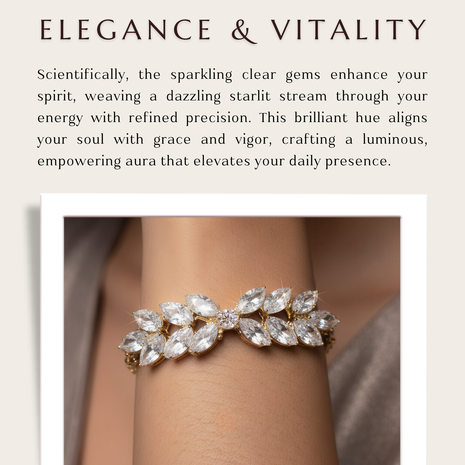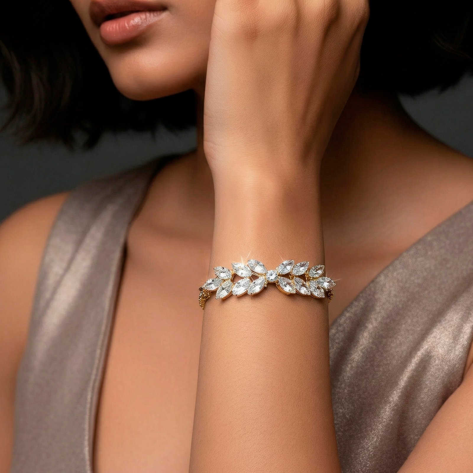 This bracelet which is designed to provide a touch of elegance to any wrist, is a sophisticated manifestation of beauty inspired by nature. Its delicate green designs, which stand for growth and freshness, evoke the allure of flowing vines. Shining white crystals accentuate each leaf, providing glimmer that exquisitely captures the light with each motion. It is appropriate for extended wear because of the delicate chain design, which guarantees a light and cozy fit. Its adjustable clasp makes sizing simple and guarantees a secure fit while boosting your personal style. This bracelet, which combines simplicity and class, is ideal for both special events and daily elegance. It elevates any jewelry collection with a sophisticated, classic shine that goes well with both formal and informal ensembles.