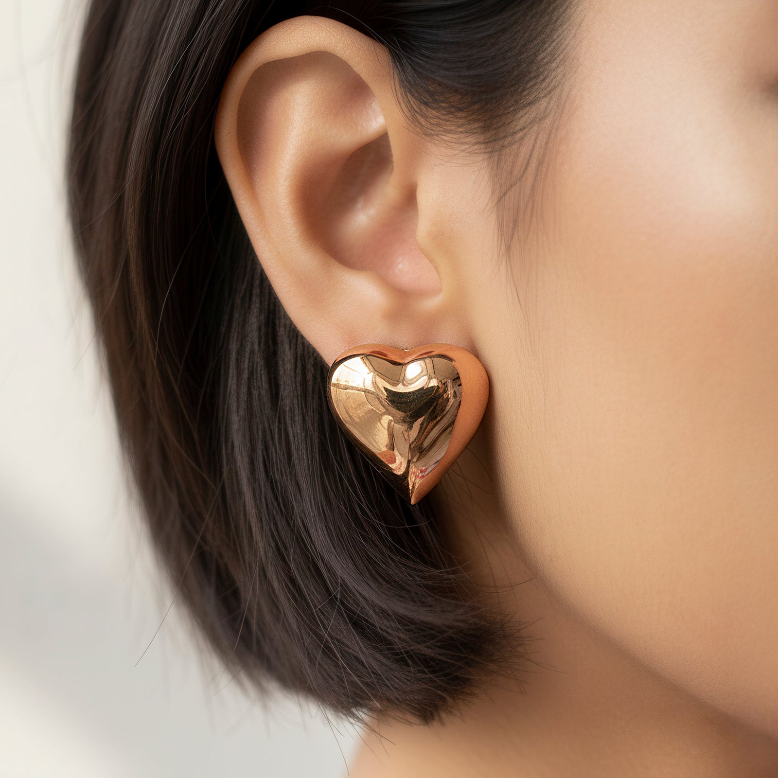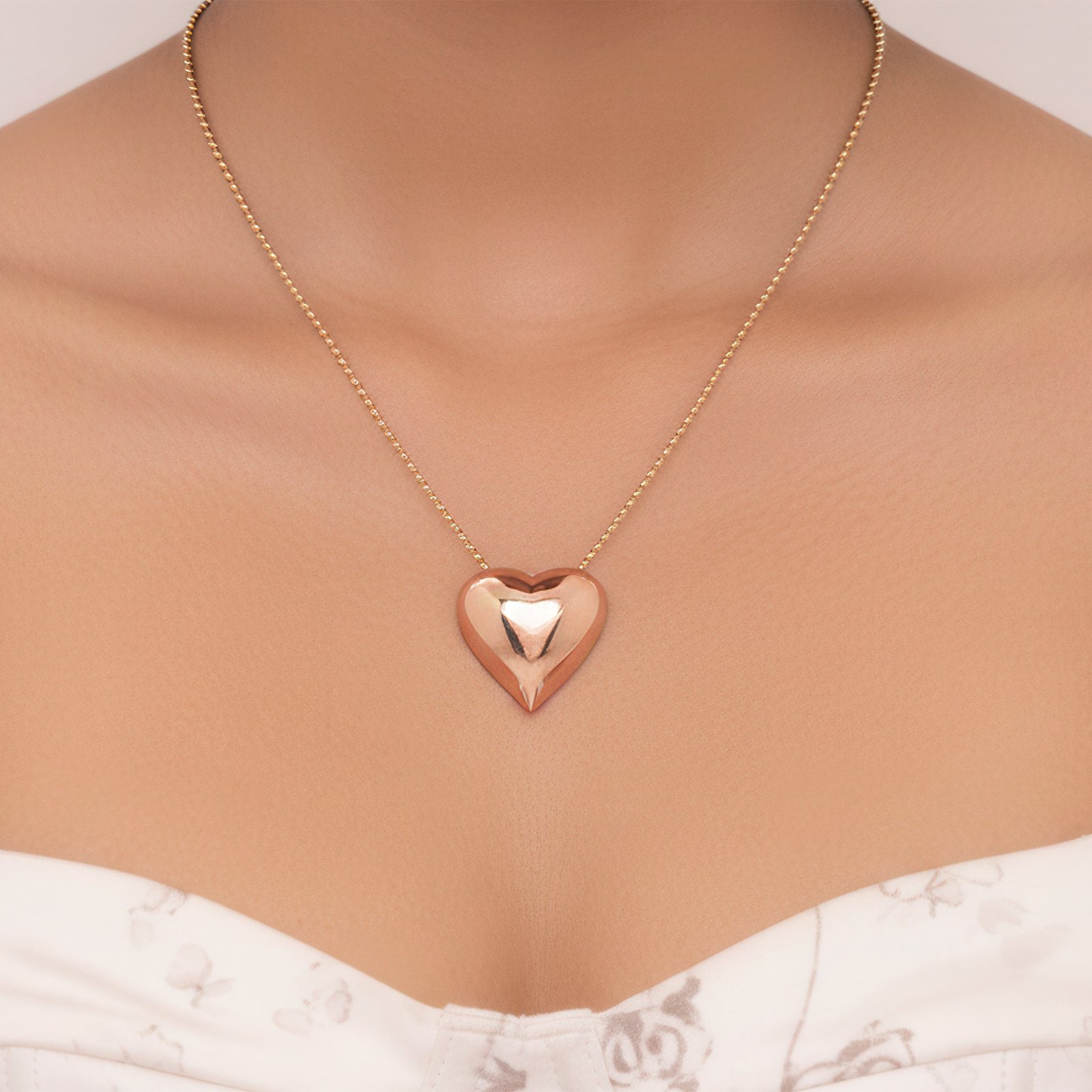 This lovely necklace and earring combination, which is carved in a beautiful rose gold finish, will add a touch of romanticism to your collection. The design adds a whimsical yet sophisticated touch to your style with its puffy heart motif, which stands for warmth and love. The heart pendant on the necklace hangs elegantly on a modern chain, and the accompanying earrings have the same design for a well-coordinated ensemble. Its lustrous sheen and delicate rose color are enhanced by the way light bounces off its polished surface. This set is comfy and lightweight, making it perfect for both special occasions and everyday wear. It is classic and adaptable, whether worn as a personal style statement or given as a token of love.