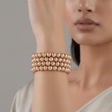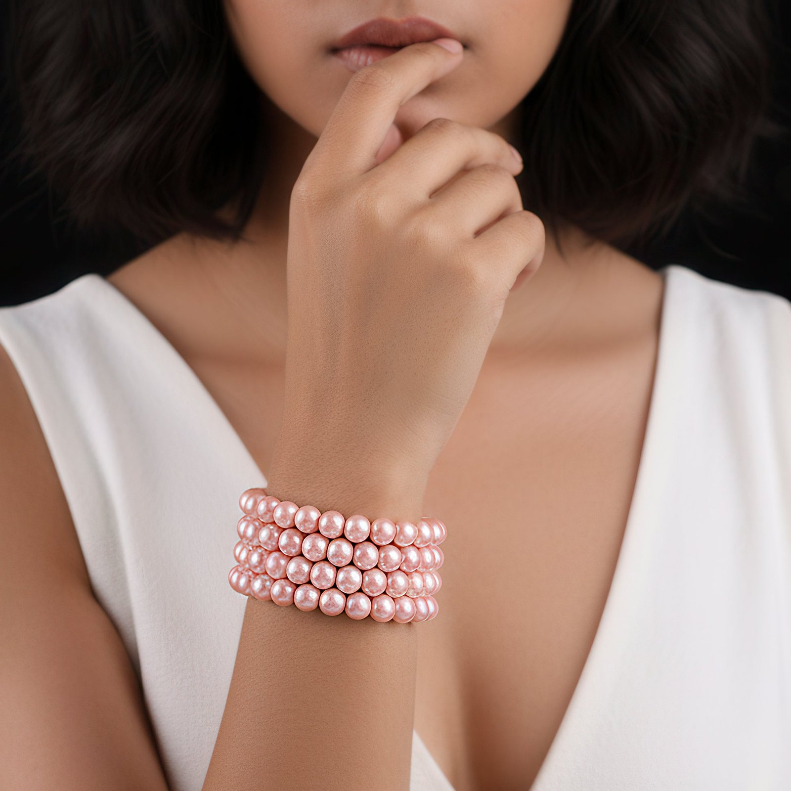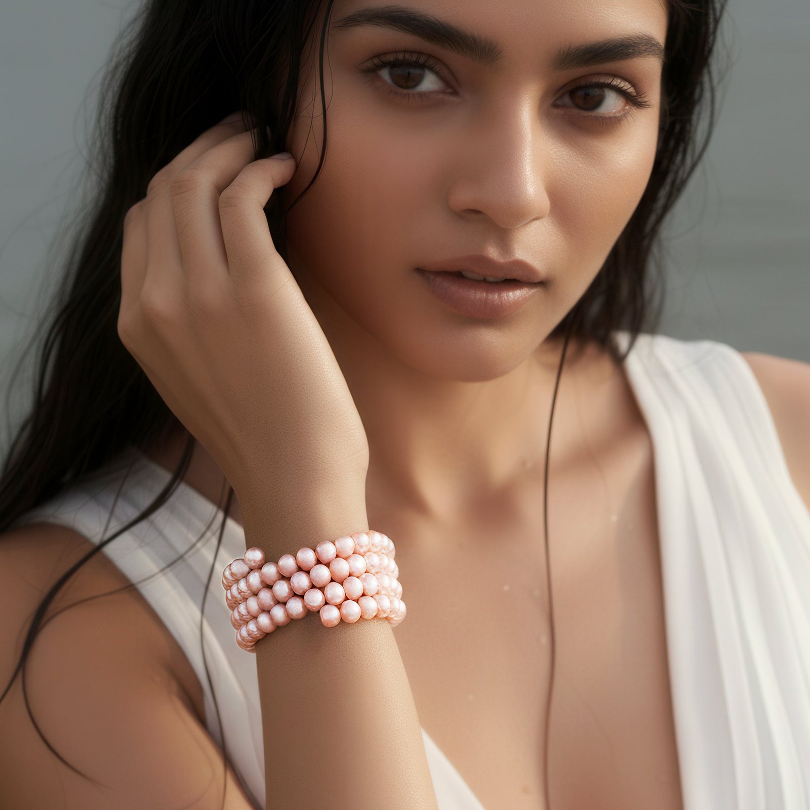 This dainty bracelet's elegant spiral pattern combines modern charm with elegance. A fresh, spring-inspired style that is both feminine and classic is created by the flowing, tiered arrangement of soft rose-pink pearls. The pearls' flawless sheen reflects light brilliantly, so the piece may be worn to evening events as well as throughout the day. Its adaptable spiral design guarantees a snug fit and effortlessly and stylishly wraps around the wrist. This bracelet is ideal for adding a modest splash of color and goes well with formal attire, celebratory ensembles, and casual wear. It offers everyday versatility and evokes a sense of elegance and romance, making it a thoughtful present option for that particular someone.