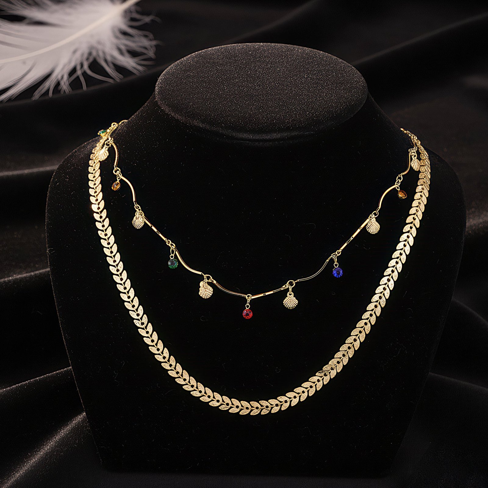 This gorgeous double-layer necklace skillfully blends contemporary elegance with seaside charm. It is crafted in a brilliant gold tone and has delicate chevron-style chains with complex shell charms and glittering multicolored crystals that give it a beachy, breezy vibe. Any neckline is accentuated by the layered design, which makes a chic statement that is both current and classic. It is comfy and lightweight, and it goes well with both dressy and casual ensembles. The shell embellishments add a touch of beauty inspired by nature, and each crystal gleams subtly in the light. This necklace exudes effortless sophistication and charm, making it ideal for everyday wear, parties, and vacations. A must-have item for fans of sophisticated yet whimsical motifs that exemplify modern, free-spirited style.