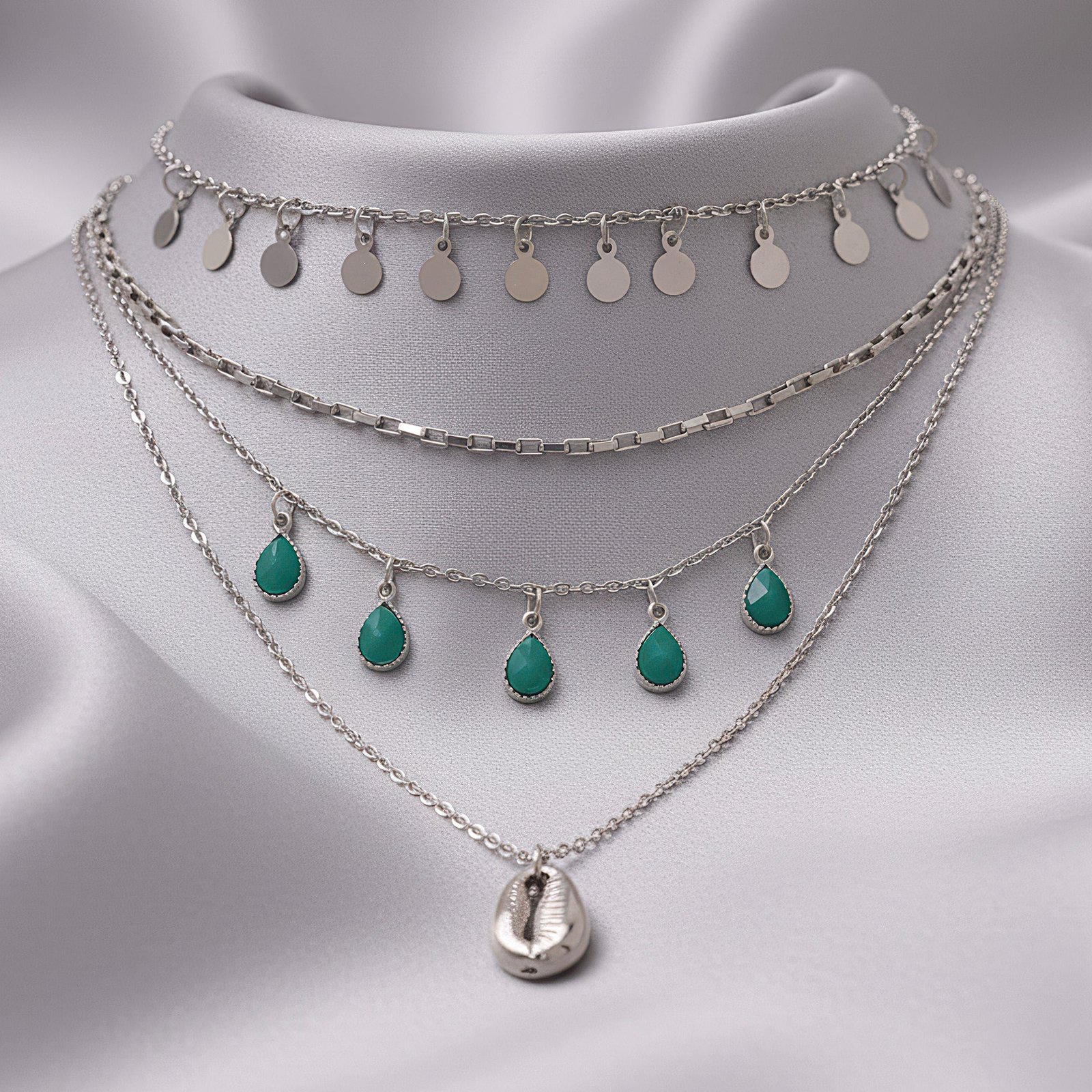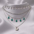 With its exquisitely placed silver chains, this gorgeous four-layer necklace blends sophistication and boho appeal. Natural stones, shimmering coin charms, turquoise gems, and delicate cowrie shell accents give depth and personality to each carefully crafted layer. The tiered pattern keeps the neckline flowing gracefully while producing a rich, statement impression. This item gives a cool splash of color and flair to any ensemble, making it ideal for beach excursions, laid-back days, or celebratory events. The silver finish adds to its classic appeal, while the turquoise accents create a serene, earthy atmosphere. This necklace is perfect for people who enjoy layering and want to effortlessly and elegantly show their free-spirited and stylish personalities because it is lightweight and adaptable.