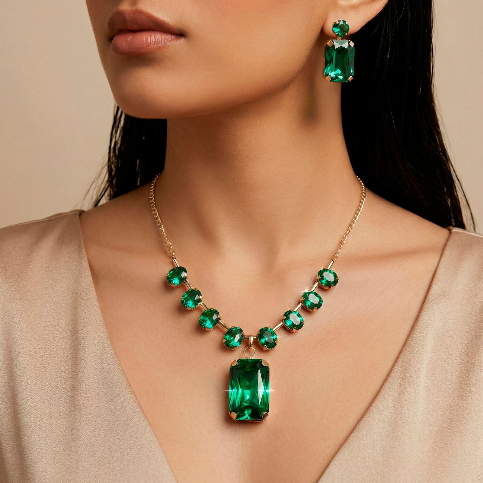 Elegance and sophistication are beautifully combined in this gorgeous necklace set. It has an eye-catching rectangular large crystal pendant in the middle, which is nicely balanced by spacer-set oval emerald gems that exude a rich, opulent radiance. The pendant creates an eye-catching focal point and exquisitely reflects light for a stunning effect. The necklace is complemented with matching earrings, which elegantly finish the ensemble. This set goes well with both classic and contemporary outfits, making it perfect for celebrations, parties, or sophisticated evenings. The vivid green color is a great option for people who enjoy jewelry that stands out with a bold yet elegant appeal since it represents luxury and timeless beauty.