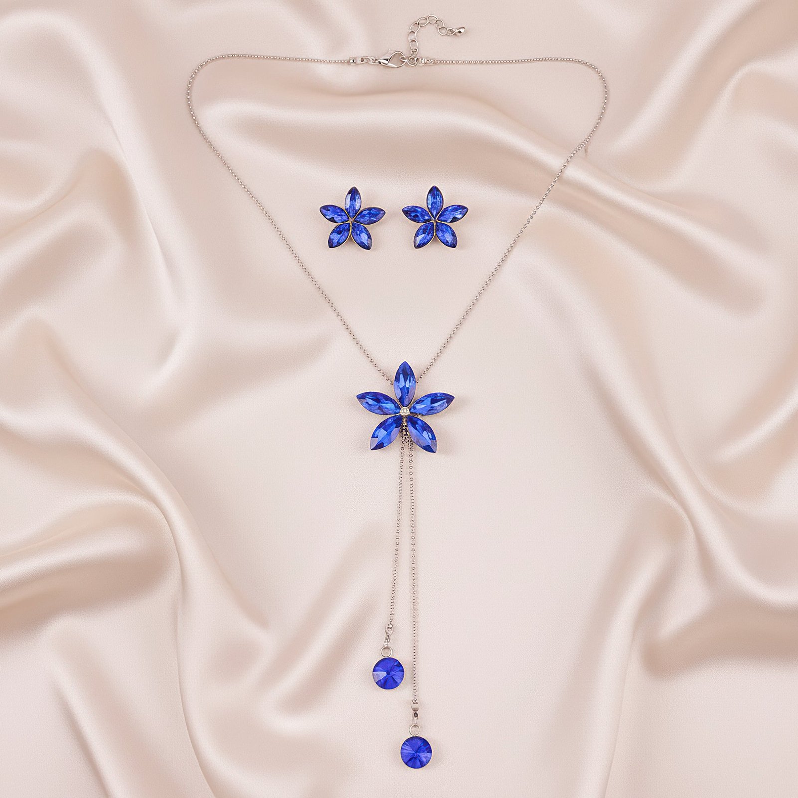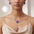 The intriguing design of this sophisticated Y-shaped necklace blends the rich attractiveness of blue sapphire crystals with the cool allure of silver. Each delicate floral pattern on the necklace is embellished with exquisitely cut blue crystals that radiate refinement and timeless beauty. The elegant Y-shaped drop accentuates the neckline and gives any ensemble a hint of refinement and charm. This garment looks great with both traditional and western attire, making it ideal for parties, weddings, or nighttime gatherings. It is a remarkable accessory for any occasion because of the opulent contrast created by the dazzling silver tones and deep blue hues. An ideal option for people who value elegant shine and sophisticated elegance.