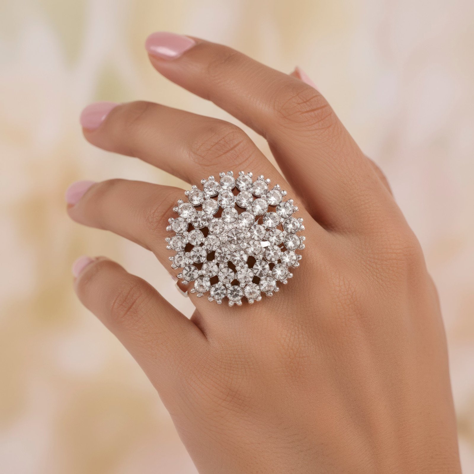This cocktail ring with crystals is made to provide bold shine and carefree glitz to any ensemble. Featuring a wonderfully organized cluster of glittering crystals, it catches the light from every aspect, producing a spectacular statement that instantly elevates your look. The design mixes sophistication with modern flair, making it great for parties, festive events, and special occasions. Its elevated setting increases brilliance without being too heavy on the finger, and its polished finish adds an opulent touch. This ring is well-made, comfortable to wear, and goes well with both modern and traditional attire. It provides a touch of sophistication and self-assurance, whether it is worn alone as a focal point or accessorized with matching pieces. Perfect for adding to your personal jewelry collection or giving as a gift.