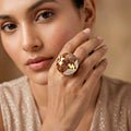 This magnificent cocktail ring boasts a big spherical crystal at its center, designed to capture attention with its radiant brilliance and timeless appeal. The big stone is skillfully faceted to reflect as much light as possible, producing a brilliant shine from all sides. Its smooth, polished band ensures a comfortable fit for all day wear while adding elegance. This ring gives an opulent touch to any ensemble, making it ideal for parties, festivities, or special occasions. It adds effortless glamor to your look whether it's worn with evening gowns or contemporary fusion clothing. It is designed to give you a sense of confidence and style while being lightweight and powerful. For people who appreciate jewelry that stands out with elegance and sophistication, this statement piece is perfect.