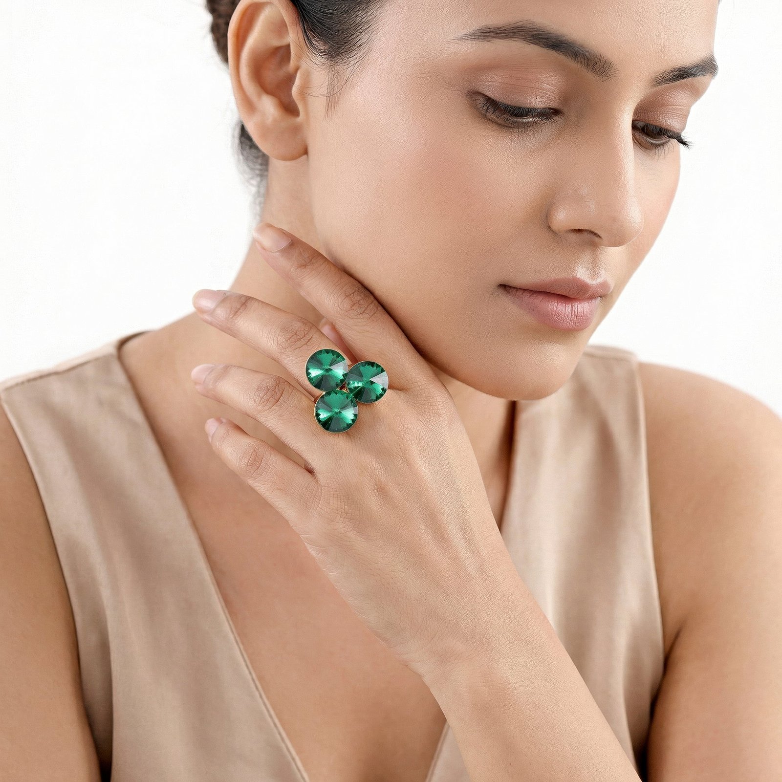 This sophisticated ring makes a sophisticated yet striking statement with its unique clubs-inspired design and sparkling crystal accents. The distinctive design is enhanced by the thoughtfully positioned crystals, which gorgeously reflect light for a delicate glitter. The ring fits nicely on the finger and feels safe to wear for extended periods of time because it is made to be both stylish and comfortable. It is appropriate for both regular styling and exceptional events like parties and celebratory get-togethers because of its well-balanced design. It provides a contemporary touch with a touch of vintage charm, making it easy to wear with fusion, western, and ethnic ensembles. This ring is a versatile item that is ideal for people who value distinctive designs with subtle beauty because of its clean craftsmanship and brilliant brilliance.